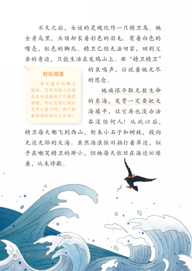 不止有创世的壮阔,书中更有一群“不服输”的英雄。刑天与黄帝争斗,战败后被砍下头颅,却不甘屈服,以双乳为眼、肚脐为口,手里仍握着干戈挥舞不止,用生命诠释“宁死不屈”;夸父为了驱散旱灾,追逐太阳一路向西,渴饮渭水、黄河,饮尽后仍不停歇,最终倒在太阳余晖下,手杖落地化为一片桃林,为后人留下阴凉,这份“明知不可为而为之”的执着,让每个读者动容;精卫本是炎帝之女,溺亡于东海后化为小鸟,日复一日衔来西山之石、树枝填海,这种坚韧藏着古人对抗苦难的勇气。