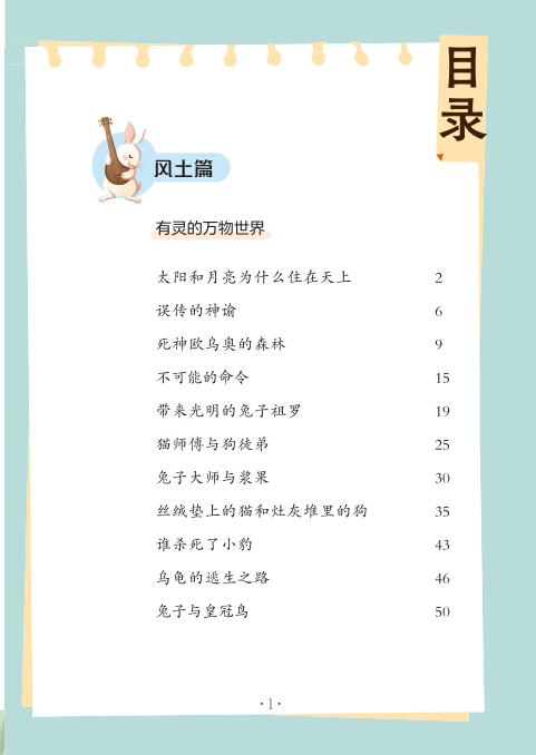 想知道太阳和月亮为何挂在天上?《太阳和月亮为什么住在天上》里,用拟人化的想象,讲述太阳、月亮与水的交往故事,给天象赋予了温暖的人情味儿。担心孩子胆小怯懦?《带来光明的兔子祖罗》中,小小的兔子通过蛛网,来到天上的国度,偷偷将天上的太阳和月亮割下一块带走,为同伴们带来光明,让孩子明白勇气不分大小。还有聪明的乌龟如何巧妙逃生,老豹子怎样侦破小豹子死亡之谜,每只动物都带着鲜明的性格,藏着为人处世的道理。