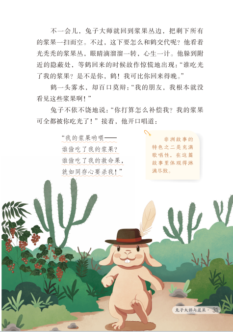 ◎ 语言鲜活,自带“表演感”:作为口耳相传的民间文学,书中语言浅显通畅,还充满音乐性。《兔子大师与浆果》里,兔子耍无赖时就放声歌唱,家长带孩子共读时可以模仿演唱,瞬间让故事“活”起来,还能锻炼孩子的语言表达能力。