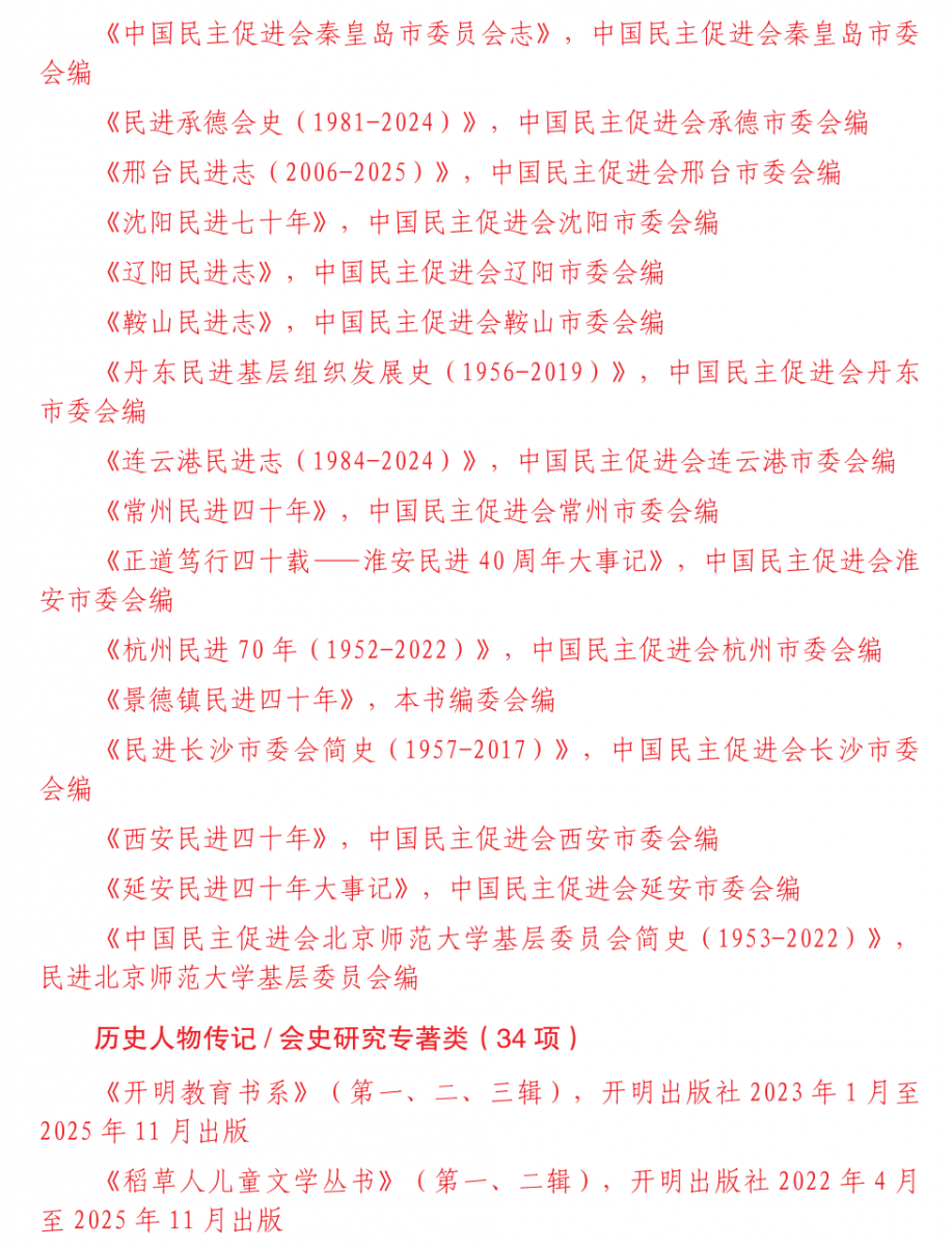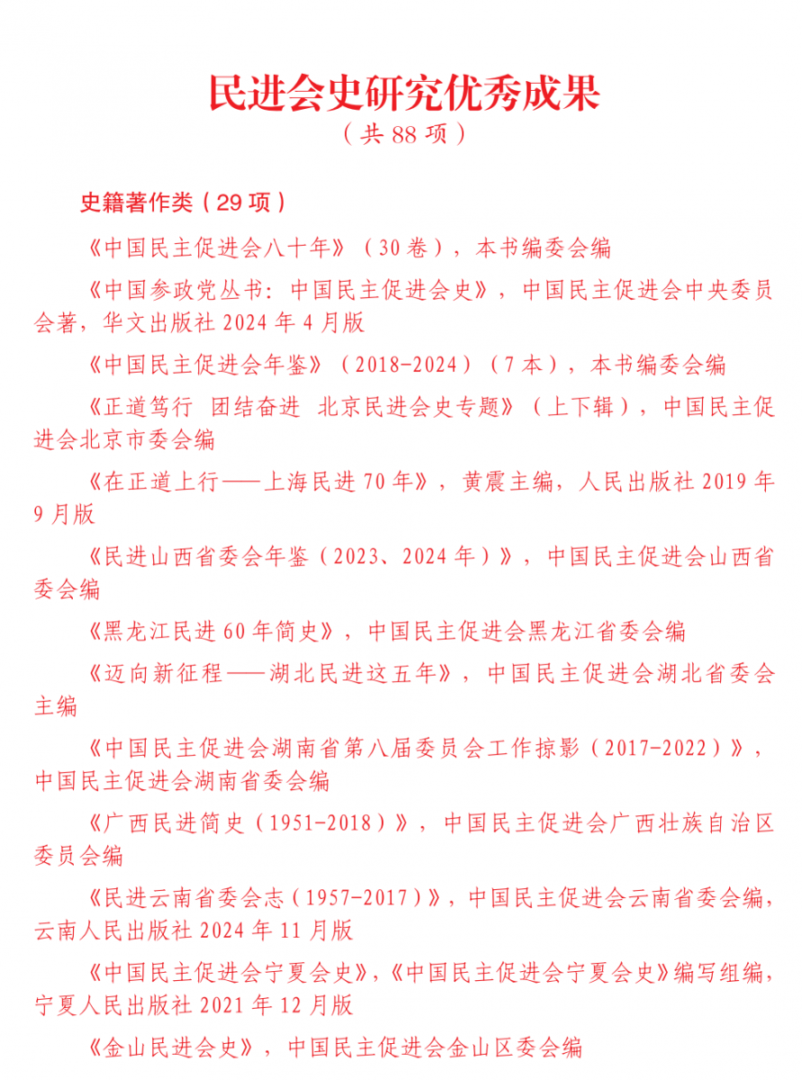 2025年是民进会史工作主题年。民进全会以习近平新时代中国特色社会主义思想为指导,学习借鉴中国共产党党史工作经验,把庆祝民进成立80周年与主题年建设任务紧密结合,在会史学习教育、会史宣传普及、会史编写、会史研究、史料收集整理、会史人物研究纪念、会史教育基地建设、会史工作队伍建设等方面取得了显著成绩,推动会史工作迈上了新台阶、开创了新局面,涌现出一批先进集体和先进个人,取得了一批会史研究优秀成果。