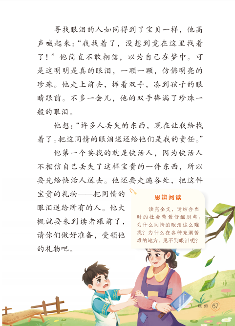 它教会孩子懂得“共情”。《稻草人》里,稻草人看着别人的苦难而心痛,《眼泪》里,主人公四处寻找“同情的眼泪”,在路上、在会场、在工厂等等地方,都没有找到,最终他在草屋的一个孩子那里找到了,他开始将众人丢失的眼泪还给他们。这些故事让孩子明白,善良不是一句口号,而是懂得体会别人的难处,用温柔的心对待世界。